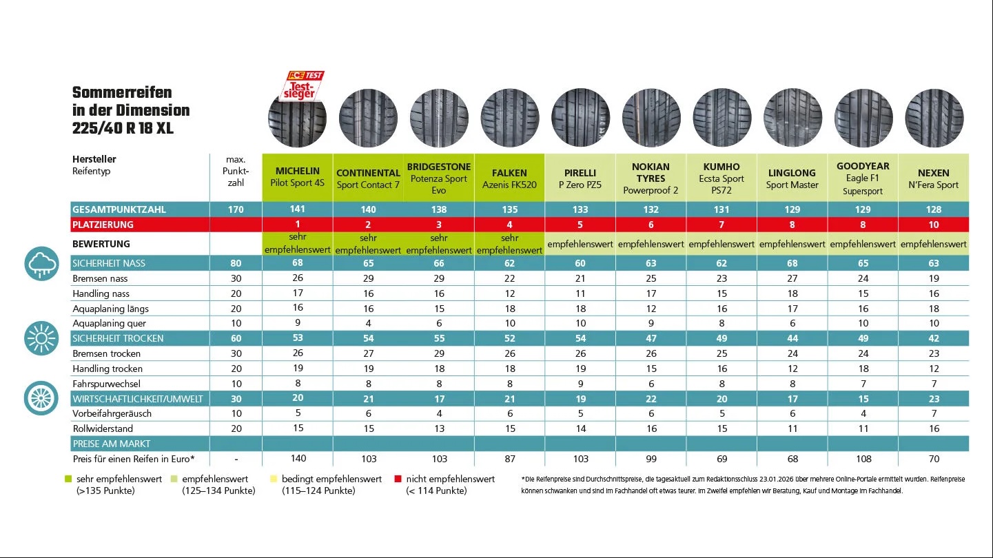 ACE-testteamet undersøkte ti sommerdekk i størrelse 225/40 R18 XL for kompaktbiler.
